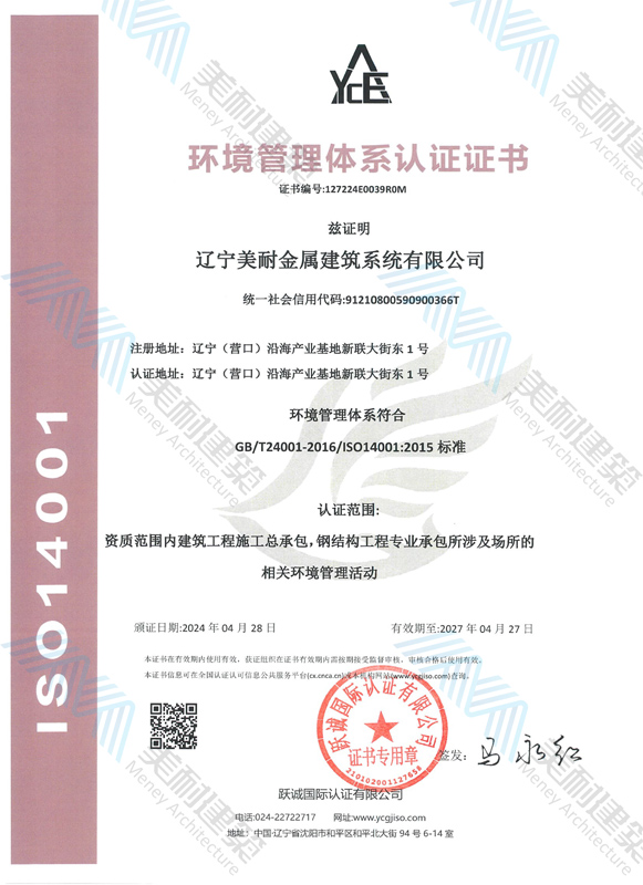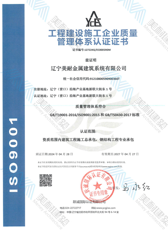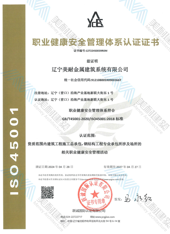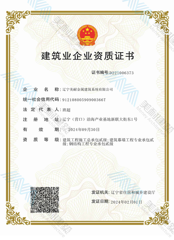 遼寧美耐金屬建筑系統(tǒng)有限公司位于遼寧(營口)沿海產(chǎn)業(yè)基地,專注于預制金屬建筑系統(tǒng)領域,是一家集工業(yè)建筑設計、制作、施工及相關的技術咨詢與服務為一體的綜合性服務企業(yè)。作為國家鋼結(jié)構(gòu)協(xié)會會員、中國建筑金屬結(jié)構(gòu)協(xié)會會員單位與國家高新技術企業(yè),美耐建筑集建筑工程施工總承包、鋼結(jié)構(gòu)工程專業(yè)承包等多種資質(zhì)于一身,并擁有22項鋼結(jié)構(gòu)建筑領域?qū)@?項軟件著作權(quán)。
